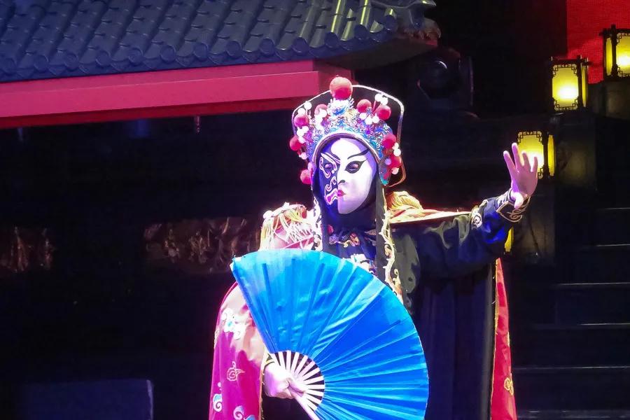 此后,变脸手法不断丰富,形成“抹脸”“吹脸”“扯脸”“运气变脸”四大类:“抹脸”以油彩涂于面部特定位置,用手一抹即变色;“吹脸”借助金粉、墨粉等粉末化妆品,贴近粉盒吹气完成变色;“扯脸”通过丝线牵引薄绸面具,在电光石火间切换形象;“运气变脸”则依靠气功使面部渐变色,如已故名角彭泗洪在《空城计》中扮演诸葛亮时,能以气息控制脸色由红转白再转青,生动展现人物如释重负的后怕心理。